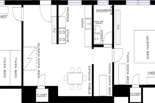 1 Double Bed, 2 Twin Beds and 3 Double Sofa Beds