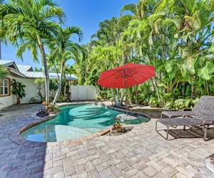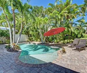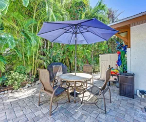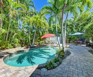 Outdoor amenities are the highlight of this charming tropical cottage. Stroll through the French doors and into your own secluded patio paradise! The large pool has a hidden surprise that will delight the very young and the young at heart! Two deck jets arc water high into the air and three further jets bubble up from the large shallow section at one end. There is also a 38” granite table top in the pool, surrounded by a built-in sitting area. The gorgeous paver patio offers plenty of lounge chairs where you can relax with a good book, a cocktail, or simply sunbathe and nap. There’s a poolside alfresco dining table with seating for four, shaded by an umbrella, and a gas BBQ grill.