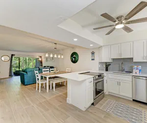 This comfortable and convenient ground floor unit has new luxury flooring the color of weathered oak. The open-concept kitchen/living/dining area makes for easy entertaining. The walls are a soothing warm neutral hue. The new living room sofa and loveseat and are adorned with coastal-themed accent pillows. The sofas are nicely arranged around a coffee table and rustic, distressed entertainment cabinet with a SmartTV.